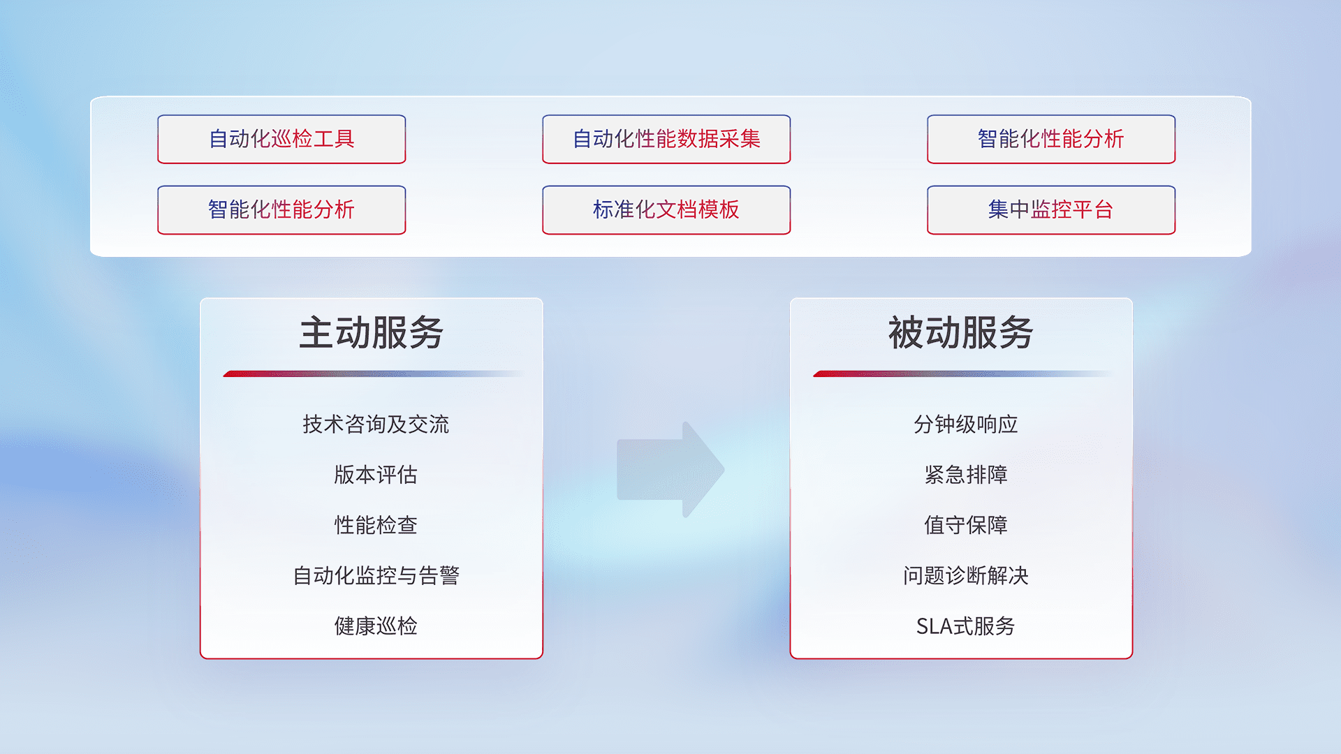 智能化工具和标准化文档,,,,保障服务质量,,,提供主动服务(包含技术咨询、、、版本评估、、性能检查、、自动化监控与告警、、、健康巡检)和被动服务包含(分钟级响应、、紧急排障、、、值守保障、、、、问题诊断解决、、、、SLA服务)。。